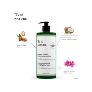 El champú sin sulfatos cabello teñidos o con mechas Nature Nutre y repara de Tahe Cosmetics es un champú nutritivo y reparador ideal para cabello teñido o con mechas. Está formulado con una combinación única de ingredientes naturales, como polifenoles naturales, aceites de coco, argán y geranio, que brindan los siguientes beneficios: